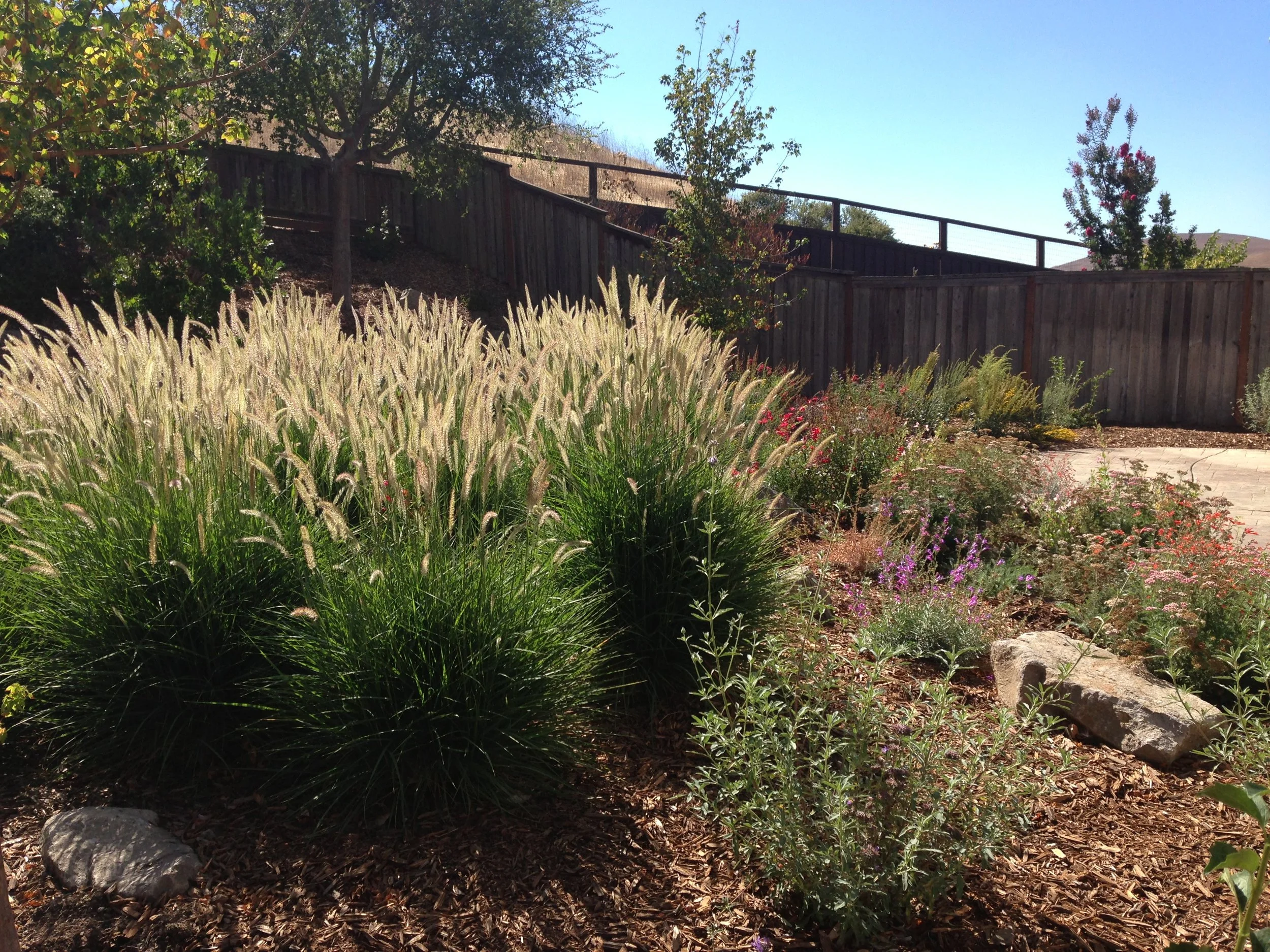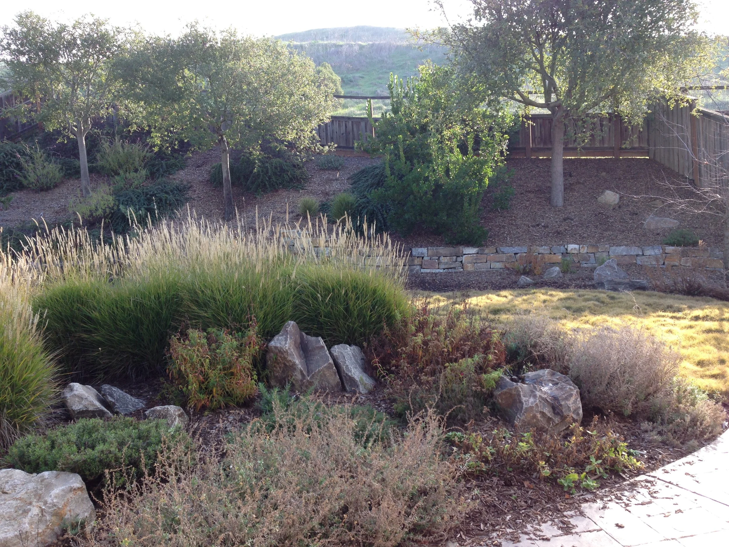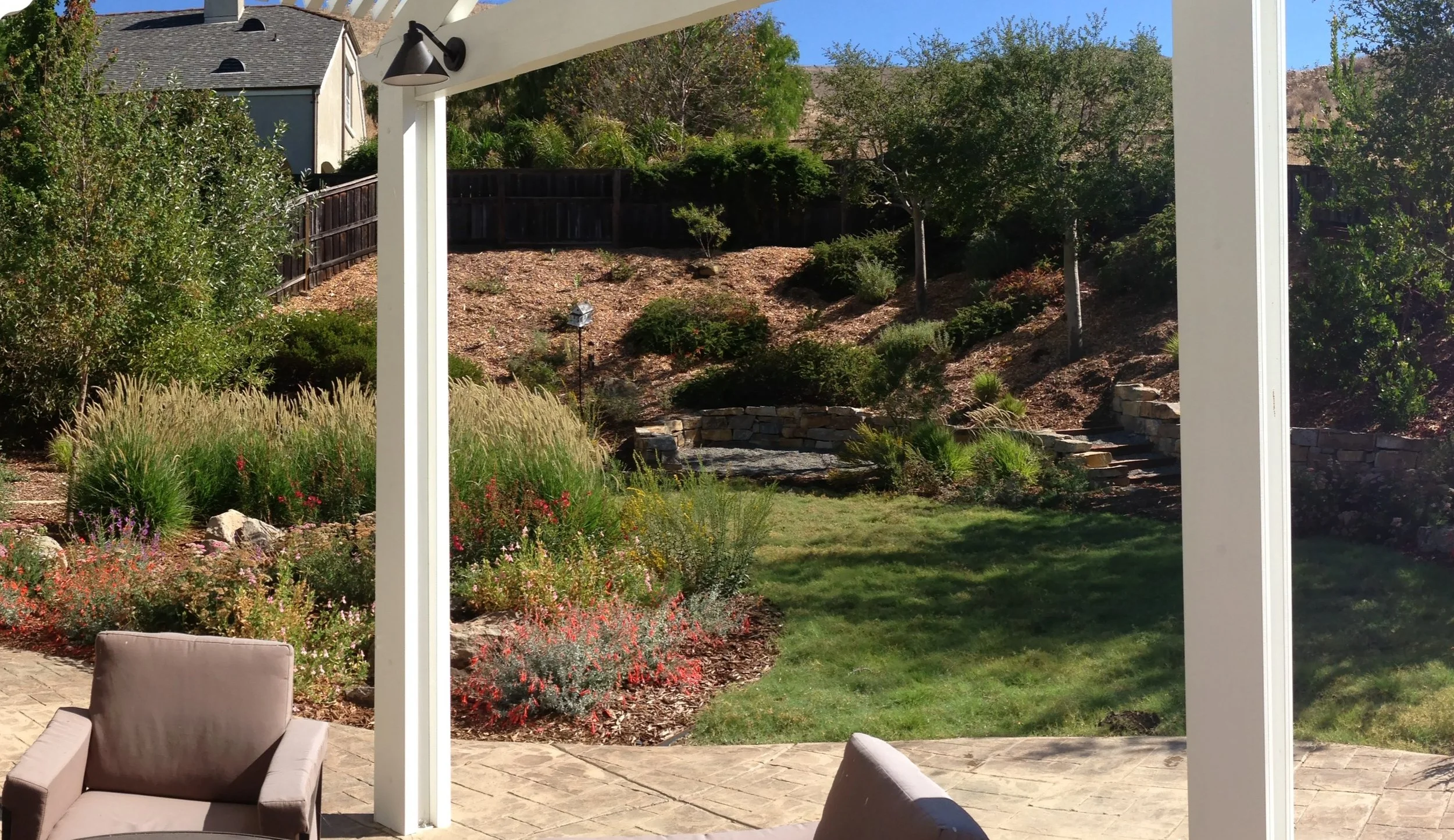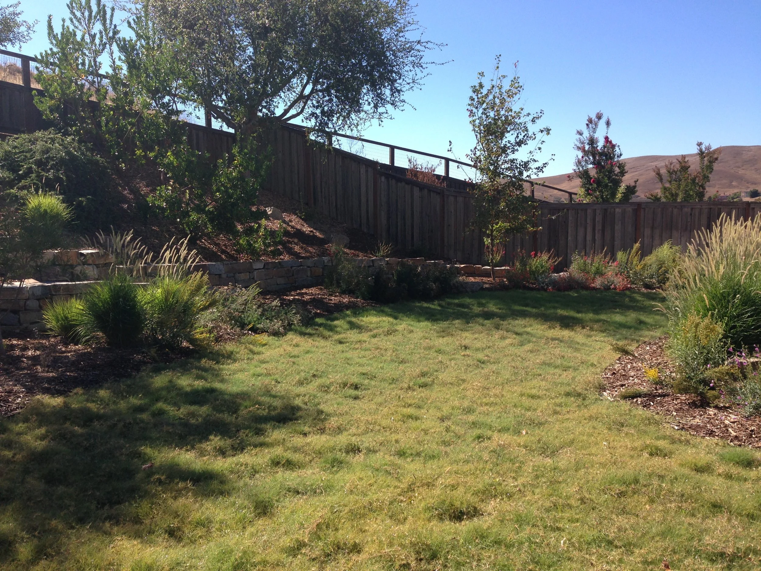 Designing for yards with hillsides is a creative challenge. In this garden the homeowner wanted open space, while bringing a meadow-like feel closer to the house. The hillside was gently terraced, and stairs were built in to give access to the space for later planting.